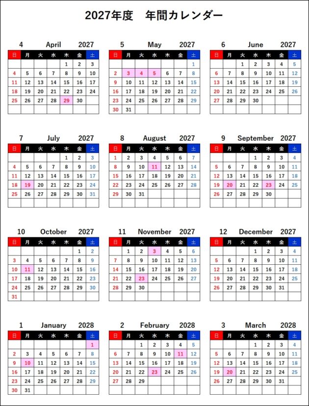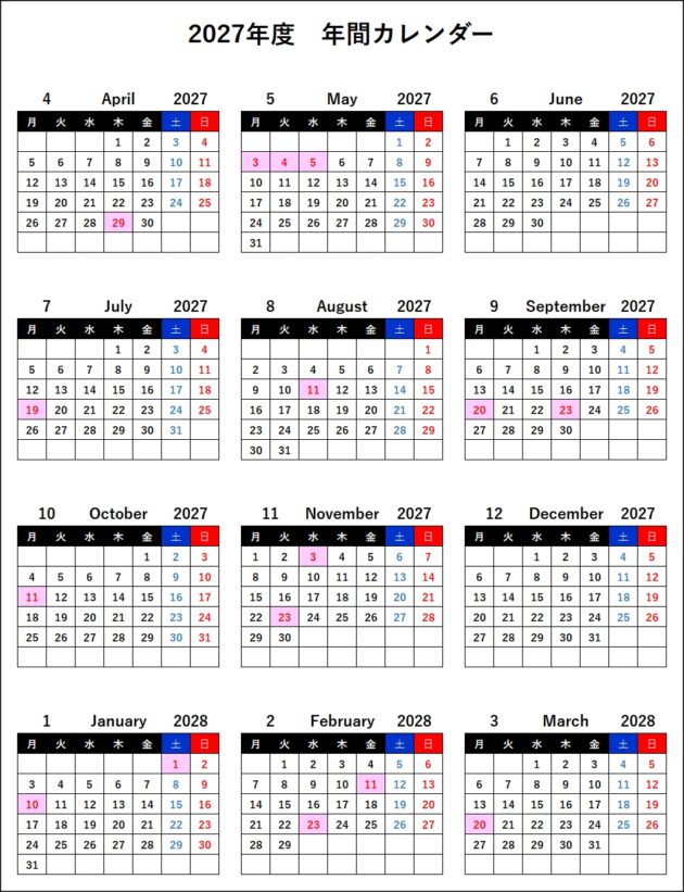 2027年度、つまり2027年4月~2028年3月の年間カレンダーも